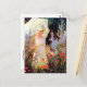 Une carte postale d'art avec la peinture de l'artiste américain Charles Courtney Curran (1861-1942), intitulée Delphiniums bleus. Une femme habillée de blanc avec un parasol admirant le jardin de fleurs bleues et rouges.