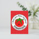 Jolie tomate ronde rouge vif avec cinq feuilles vertes pour cheveux et un visage souriant heureux. Au-dessus et en dessous de la tomate se trouve un jeu de mots amusant en noir disant "Je t'aime des tomates de ma tête". Le fond est rouge avec un motif rétro à pois jaunes.