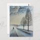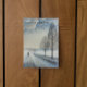 peinture d'une silhouette s'éloignant au loin dans un paysage hivernal, oiseaux volant dans le ciel, couleurs bleues et blanches. texte personnalisable