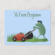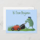 Une drôle de grenouille verte tondant la pelouse dans un style humoristique idiot.