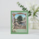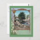 Un mouton et son chien poussent un troupeau de moutons et d'agneaux sur un chemin de terre au-delà d'un lac où se trouve une vache. La vignette est encadrée de branches de bois nu et de tulipes blanches. Une cloche sonne dans cette carte de gratte-ciel victorien datant de la fin des années 1800.