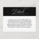Une élégante carte d'enceinte à envoyer avec vos invitations de mariage, cette carte de détails a le texte titre en belle calligraphie argentée sur un arrière - plan noir contrasté avec un modèle texte pour inclure des détails importants pour vos invités mariages. Incluez toutes les informations que vous souhaitez transmettre à vos invités, c'est-à-dire les informations sur l'hôtel, les itinéraires routiers, les événements spéciaux ou les rassemblements pendant votre semaine de mariage, votre site Web mariage ou toute autre information que vous souhaitez fournir à vos invités. Entrez votre texte à la place de l'exemple de texte. Si vous devez repositionner le texte pour le centrer, ou modifier la taille de la police/police, choisissez "customiser plus loin". Vous pouvez faire glisser le texte à l'emplacement souhaité pour le recentrer.
