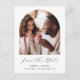 Cette simple et minimaliste carte postale Save the Date présente une photo en arc au-dessus des mots "Save the Date" dans un élégant script d'écriture noire, suivi des noms du couple, date mariage et ville en sans serif police sur un arrière - plan blanc. Ajoutez une deuxième photo horizontale rectangulaire au dos, ainsi que votre adresse de retour et le texte supplémentaire avec plus d'informations ou de détails.