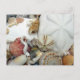 Carte postale de photographie de coquillages. Des images de jolis coquillages tels que le dollar des sables, le cadran solaire, l'oursin, les coquilles de coque rose et orange, les escargots vers frisés et d'autres espèces marines couvrent le recto. Le verso est vierge pour être utilisé à toute occasion, ou envoyé depuis des vacances tropicales à la plage.