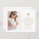 Cette carte de remerciement classique de première sainte communion catholique comporte une photo sur le devant avec une simple croix et une typographie de couleur or sur fond blanc, ainsi qu'un doux message de remerciement modifiable. Le verso comprend une deuxième photo et l'adresse de retour. Cette carte de remerciement de première sainte eucharistie est modifiable pour diverses occasions religieuses chrétiennes, ou pour mettre à jour votre propre message de remerciement personnel.