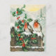 Vintage Christmas Illustratation of two little robins sitting on a fence with holly berries in the snow.