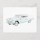 Posez une courte note manuscrite sur cette carte postale Chevy Bel Air 1955 avec un dessin au crayon bleu et blanc de cette voiture classique de l'avant et côté conducteur.
