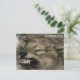 Loups gris avec ses dents avant et gomme rose montrant.l'oeil jaune loup vous regardant avec une oreille vers le haut et une oreille vers le bas cette carte de poste a le texte ce qu'il est pour le dîner sur le devant vous pouvez changer le texte à ce que vous voulez qu'il soit.