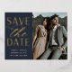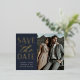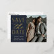 Une carte postale moderne enregistrez la date conçue pour accueillir votre photo fiançailles à fond à orientation verticale ou portrait préférée. "Enregistrer la date" apparaît à côté de votre photo dans un bloc de feuille d'or et des lettres de script, avec vos noms, date mariage et emplacement du mariage en dessous. Les cartes postales sont inversées pour afficher d'autres détails sur la date, y compris votre site Web mariage, avec votre adresse de retour et l'espace pour l'adresse du destinataire.