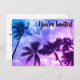 Cette carte postale d'invitation pour une fête d'anniversaire présente une photo de palmiers. Le filtre utilisé donne aux arbres et au ciel une couleur violette et bleue amusante. Le texte de l'invitation peut être personnalisé pour votre événement.