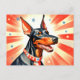 Cet art montre un chien Doberman Pinscher entouré d'étoiles et de rayures rouges, blanches et bleues.