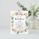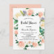 Une invitation à la douche nuptiale fleurie tendance en blanc, or rose et rose roux. Un arrière - plan blanc chic à l'avant. Décoré de grandes fleurs verdoyantes aux couleurs de l'eau, de fleurs blanches, d'or rose, de rose vif et de verdure. Personnalisez et ajoutez le nom de la mariée et les détails du parti. Texte noir. Retour : arrière - plan rose couleur or, design carte postale. Conseil : Si vous ne voulez pas qu'il ressemble à une carte postale, cliquez sur customiser, allez à l'arrière et retirez le séparateur et le timbre postal.