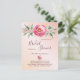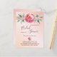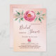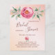 Un arrière - plan rose or et rose vif dégradé. Un grand rose rose aquarelle, des feuilles verts, un feuillage avec de petites fleurs dorées. Le texte : Fête des mariées est écrit avec un script de style écrit à grande main. Personnalisez et ajoutez un nom et des détails du parti. Lettres de couleur or rose foncé. Dos : or Rose, arrière - plan rose vif. Conseil : Si vous ne voulez pas qu'il ressemble à une carte postale, cliquez sur customiser, allez à l'arrière et retirez le séparateur et le timbre postal.
