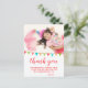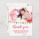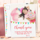 Joli drapeau à flots photo d'anniversaire merci carte postale. Merci à votre invité d'être venu à la fête d'anniversaire de votre enfant! Le design a des drapeaux colorés de fête d'anniversaire et une photo - insérez votre photo dans le modèle. Le texte est le script tendance - changer le message de remerciement si vous voulez et le nom de l'enfant.