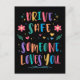 Warm reminder message with colorful hand lettering on a dark background. A gentle and emotional phrase that encourages safe driving and shows care, love, and connection for family, friends, and loved ones.