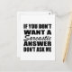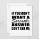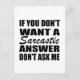 Si vous aimez les citations sarcastiques drôles ou de grands dessins humoristiques alors ce slogan original "Si vous ne voulez pas de réponse sarcastique, ne me demandez pas" est pour vous. C'est un grand cadeau pour votre famille, vos amis ou vous-même ! Ce design est idéal pour tous ceux qui aiment le sarcasme et l'humour. Si vous aimez cette citation drôle, découvrez d'autres oeuvres similaires dans le magasin Omitay. Restez en sécurité et merci de soutenir un artiste local.