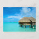 Carte postale d'un bungalow en lune de miel surplombé d'un toit de chaume dans le lagon bleu turquoise de l'île tropicale de Bora Bora, près de Tahiti en Polynésie française.
