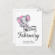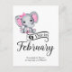 Adorable petit éléphant avec pois rose et petit arc rose sur l'oreille, typographie "Due in February", et modèle pour message spécial annonçant la grossesse.