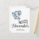 Adorable petit garçon éléphant avec pois bleu, typographie "Due en Novembre", et modèle pour message spécial annonçant la grossesse.