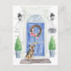 Annoncez votre nouvelle adresse avec notre faire-part élégante avec un Terrier frontalier, une porte d'entrée bleue, un tapis de bienvenue, une ardoise, des topiaires et une couronne fleurie posée sur un arrière - plan en brique grise.