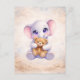 Envoyez un peu de douceur par la poste avec cette adorable carte postale de bébé éléphant représentant un éléphant adorable serrant un ours en peluche doux. Avec ses grands yeux brillants et ses couleurs pastel douces, cette charmante illustration capture la chaleur, le confort et l'amitié de la manière la plus mignonne.