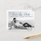 Mariage de script bleu poussiéreux moderne Save the Date photo carte postale. Cette typographie contemporaine Save the Date design comprend une photo en noir et blanc du couple et le texte "Save the Date" dans une police de caractères de script moderne.