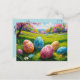 This Easter postcard was designed with an artistic feel. The eggs are made to look like paper quilling and the colors are pastel. The background is a lush meadow popping with Spring colors and blooms. The back of the postcard has a powder blue background with a "Happy Easter" graphic in script typography. There is still room to write a personal greeting. The back of the card also features address lines and stamp box in matching color.