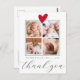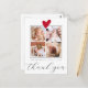 Ce modèle de carte de remerciement de baby shower chic à quatre photos présente un look moderne élégant noir et blanc avec une touche de couleur rouge. Il comporte quatre de vos photos préférées de bébé, un en-tête "merci" en calligraphie élégante, et le nom et la date de naissance de votre bébé dans une police chic. Les photos sont liées par un cadre carré délicat et un cœur rouge, ressemblant à une boîte-cadeau couronnée d'un nœud ! Simple et imaginatif ! Le verso comporte votre message de remerciement personnalisé et un petit cœur bohème. Utilisez les outils de conception intuitifs, vos photos préférées et votre inspiration, et faites de cette carte de remerciement de baby shower / annonce de nouveau-né à collage multi-photo minimaliste et élégant quelque chose d'unique !