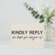 Dans le texte modifiable "gentiment répondre" a été placé, grand et gras, sur le devant. Dans une écriture décontractée moderne, un graphique représentant "Nous espérons que vous pouvez vous joindre à nous !" apparaît ci-dessous. Au verso, la même police unique a été utilisée pour créer des graphiques qui lisent "rsvp", "m" et "gentiment livrer à :" et tout autre texte est modifiable. Utilisez les champs modèle pour personnaliser autant que vous le souhaitez. L'avant a un arrière - plan élégant qui peut être changé à n'importe quelle couleur que vous préférez. // 100 //