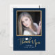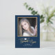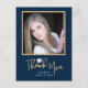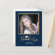 Un simple diplômé vous remercie carte postale avec une photo carré accentuée avec une bordure de parties scintillant en faux or sur un arrière - plan bleu foncé. Le design offre du texte de style manuscrit doré. Le backside offre du texte personnalisé pour votre propre message de remerciement personnel.