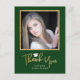Une simple remise de diplômes vous remercie carte postale avec une photo carré accentuée avec une bordure en parties scintillant d'or faux sur un arrière - plan vert émeraude foncé. Le design offre du texte de style manuscrit doré. Le backside offre du texte personnalisé pour votre propre message de remerciement personnel.