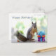 Un écureuil pose entre deux cadeaux aux couleurs vives sur cette photo originale. "Joyeux anniversaire !" est écrit en écriture au-dessus de l'écureuil.