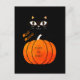 Gros yeux chat noir debout derrière un citrouille orange sur un arrière - plan sombre, avec la phrase "Trick or Treat" et disant "Boo Meow". Très mignon et éffrayant pour Halloween. Vous pouvez modifier les textes et personnaliser à votre goût.
