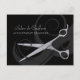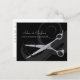 Elégante carte postale de rendez-vous salon de coiffure noir et argent avec une paire de ciseaux en faux argent entrelacée dans une silhouette douce de belles boucles. Personnalisez en entrant les informations du coiffeur professionnel ou du coiffeur et les coordonnées. Idéal pour le client qui manque vos cartes. Impression plane, NON métallique argent.