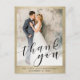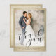 Merci à vos invités mariages dans le style avec cette photo personnalisée élégante merci carte postale. Ce modèle de design typographique présente votre photo sur le devant bordé d'un faux or avec les mots "Merci" et vos noms avec date mariage à personnaliser. Le dos de la carte postale a un message personnalisé et une signature sur un faux arrière - plan or. Conçu par l'artiste Susan Coffey.