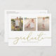 Ce design comprend un simple modèle d'invitation à la remise de diplômes photo, avec code QR et URL Facebook pour le site Web et la page d'événement en ligne. un 3 image élégant faire-part, avec une calligraphie simple moderne, typographie de script tendance, idéal pour la verticale du lycée ou du collège, un invitation de remise de diplômes, un design minimaliste d'étudiant principal, de grandes félicitations, avec du texte or et un arrière - plan blanc