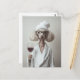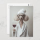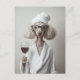 Un caniche sophistiqué aux traits humains profite d'un moment spa relaxant, habillé d'une robe blanche et d'un turban, sirotant du vin rouge tout en portant des lunettes élégantes.