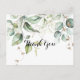 Cette élégante calligraphie dorée grâce à votre carte postale est parfaite pour un mariage moderne. Le design se compose d'or dessiné à la main et de feuilles d'eucalyptus verts botaniques, inspirant la beauté artistique. Customisez le dos de la carte postale, y compris vos noms, votre adresse de retour et un message de remerciement. Ou, laissez la section de modèle de message de remerciement vide pour rédiger quelques mots sur chaque carte après leur arrivée. Ces cartes peuvent être utilisées pour un mariage, une douche nuptiale, ou chaque fois que vous voulez dire merci.
