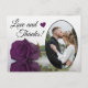 Cette belle carte postale est une façon simple mais soignée de remercier vos invités mariages. Il présente un joli design avec votre photo mariage dans un cadre ovale, et un seul rose à long tige de prune violet ou aubergine se reflétant dans un bassin d'eau. La légende dit "Amour et Merci" et il y a de l'espace pour votre note personnalisée au dos ainsi que votre signature.