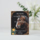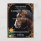 Ce design faire-part de mariage présente un cheval saisissant, gracieusement placé contre un arrière - plan beige chaleureux. Des motifs ornés de fleurs et de défilement encadrent l'image, ajoutant une touche de sophistication et de charme. Les détails complexes de la frontière dans les tons noir et or évoquent une élégance intemporelle, ce qui en fait une représentation parfaite de l'amour, de la force et de la beauté pour une célébration mariage mémorable. Options de personnalisation : Personnalisez avec vos noms, date mariage et détails du lieu pour créer une conservation unique pour votre journée spéciale.