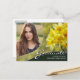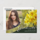 Une carte de vœux de remise de diplômes personnalisée unique, avec des éléments de design d'écriture manuscrite élégante et un texte moderne. La photo du diplômé est mise en valeur par de belles fleurs jaunes sur un fond vert forêt. Le verso de la carte propose des espaces de texte personnalisables pour des informations sur la remise de diplômes et le parcours futur. Pour voir d'autres articles similaires, visitez ma boutique ici sur "www.Zazzle.com/LakeViewCardCo". Merci