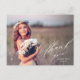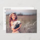 Cette élégante carte postale de remise de diplômes vous offre une photo complète et une calligraphie élégante. "Merci" est écrit dans un joli script blanc dans le coin inférieur droit, avec le nom du diplômé et l'année de fin d'études ci-dessous. Ce design de typographie blanche recouvre une photo complète du nouveau diplômé (orientation horizontale/paysage). À l'arrière, vous pouvez écrire un message personnalisé aux destinataires ou supprimer le texte modèle pour créer une zone vide pour une note manuscrite.
