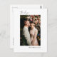 Elégant et moderne Calligraphie Script Mariage Carte postale Merci en noir et blanc à envoyer après votre mariage. Customisez-le avec vos propres noms (et la date du mariage si vous voulez) et l'image de mariage préférée sur le devant, tapez votre message au verso ou supprimez le texte au verso et ajoutez votre note manuscrite. Toutes les couleurs sont personnalisables et vous pouvez supprimer les lignes d'adresse dans l'outil de conception.