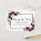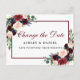 Elégante aquarelle moderne Bourgogne Marsala Floral Change La date Mariage Postponement Carte postale avec roses bordeaux, roses roses roses, fleurs bleues, verdure et cadre bordeaux
