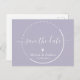 NewParkLane - Carte postale mariage personnalisée sophistiquée, avec une citation "Save the Date" dans une élégante typographie script avec glyphes / calligraphie, un petit coeur blanc, et un cadre rond pointillé, contre un arrière - plan lavande. Un design chic et élégant pour remercier vos invités d'avoir assisté à votre mariage. Facile à customiser à Zazzle avec votre propre texte pour un design personnalisé. Tous les styles, couleurs et tailles de texte peuvent être modifiés selon vos besoins, ainsi que la couleur arrière - plan. Consultez cette collection pour les articles correspondants. Avez-vous des souhaits particuliers en matière de design personnel? N'hésitez pas à me contacter.