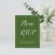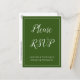 Cette carte de réponse élégante et respectable présente le message "Merci de répondre" sur le devant, ainsi que le nom personnalisable de l'événement ou de l'occasion. Elle comporte également un formulaire de réponse personnalisé au verso, ainsi qu'une adresse personnalisée à laquelle les cartes de réponse remplies doivent être envoyées. Des cartes de réponse comme celle-ci peuvent être utilisées pour savoir qui participera à une fête de retraite, une fête de Noël, une fête d'anniversaire de mariage, une réception de mariage ou une autre célébration.