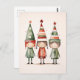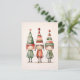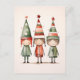 Trois adorables elfes de Noël habillés de tenues festives vertes et rouges, chacun avec des hauts casquettes uniques décorés d'étoiles, de rayures et de motifs d'hiver. Leur style mignon et minimaliste reflète l'esprit des vacances d'une manière délicieuse.