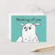 Cette carte postale présente une chouette mignonne disant "En vous pensant", sur un fond bleu-vert. J'ai dessiné cette petite chouette au stylo. Voir ma boutique pour plus de cadeaux de chouette.