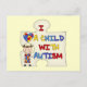 Une grande pièce de puzzle, un coeur composé de pièces de puzzle, une figurine en bâton brune cheveux, et un texte qui dit "I Love a Child With Autism" sur des T-shirts, des tasses, des cartes, des autocollants, des sacs fourre-tout, des magnets, des porte - clés, des journaux, des mousepads, et d'autres vêtements et cadeaux.