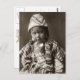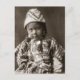 Portrait vintage d'un enfant indien de Wishham, assis, portant un panier comme un casquette, une robe en coton plaid, et des perles de coquillages décorées avec des dollars d'argent. Photo c1910 d'Edward S. Curtis, LOC.